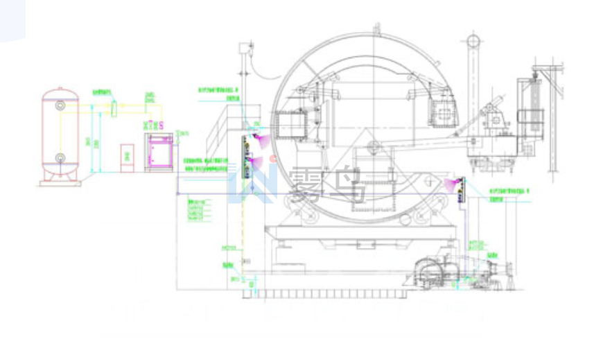 翻車機的微米級干霧抑塵系統(tǒng)由水箱、多級過濾恒壓供水站、空氣壓縮機、儲氣罐、微米級干霧抑塵主機、干霧箱控制器、噴霧箱、霧化管道、集中控制系統(tǒng)、配電箱等組成。 在翻車機傾翻側上面安裝5套ST2-7-60干霧箱總成,1套STK-A干霧箱控制器,1套STK-W干霧箱控制器,在傾翻側下面安裝3套ST2-7-60干霧箱總成,1套STK-A干霧箱控制器,1套STK-W干霧箱控制器,在背翻側設計安裝6套ST2-7-60干霧箱總成和1套SKT-A干霧箱控制器、1套SKT-W干霧箱控制器,干霧箱總成噴霧時間30s,周期2min。
